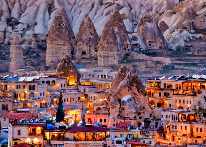 أرض العجائب كابادوكيا، وهي منطقة شبه قاحلة في وسط تركيا، وتشتهر بــــ”مداخنها الخيالية” المميزة، والتكوينات الصخرية الطويلة المخروطية الشكل المتجمعة في وادي الرهبان وجوريم وأماكن أخرى.